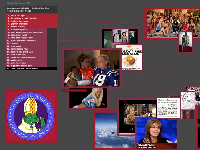 I wrote a program that gathers the most recent information from different sources online, then displays it in the form of text and a related picture on screen. The user can then interact with the search term in order to learn more about recent activity including if it has become more or less popular over the last hour.